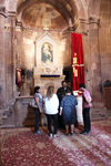 Ceiling and dome. | Etched inscriptions on wall. | Conferring with the priest. | Nearby is this colorful mineral formation. | Sunset on our return to Yerevan. |