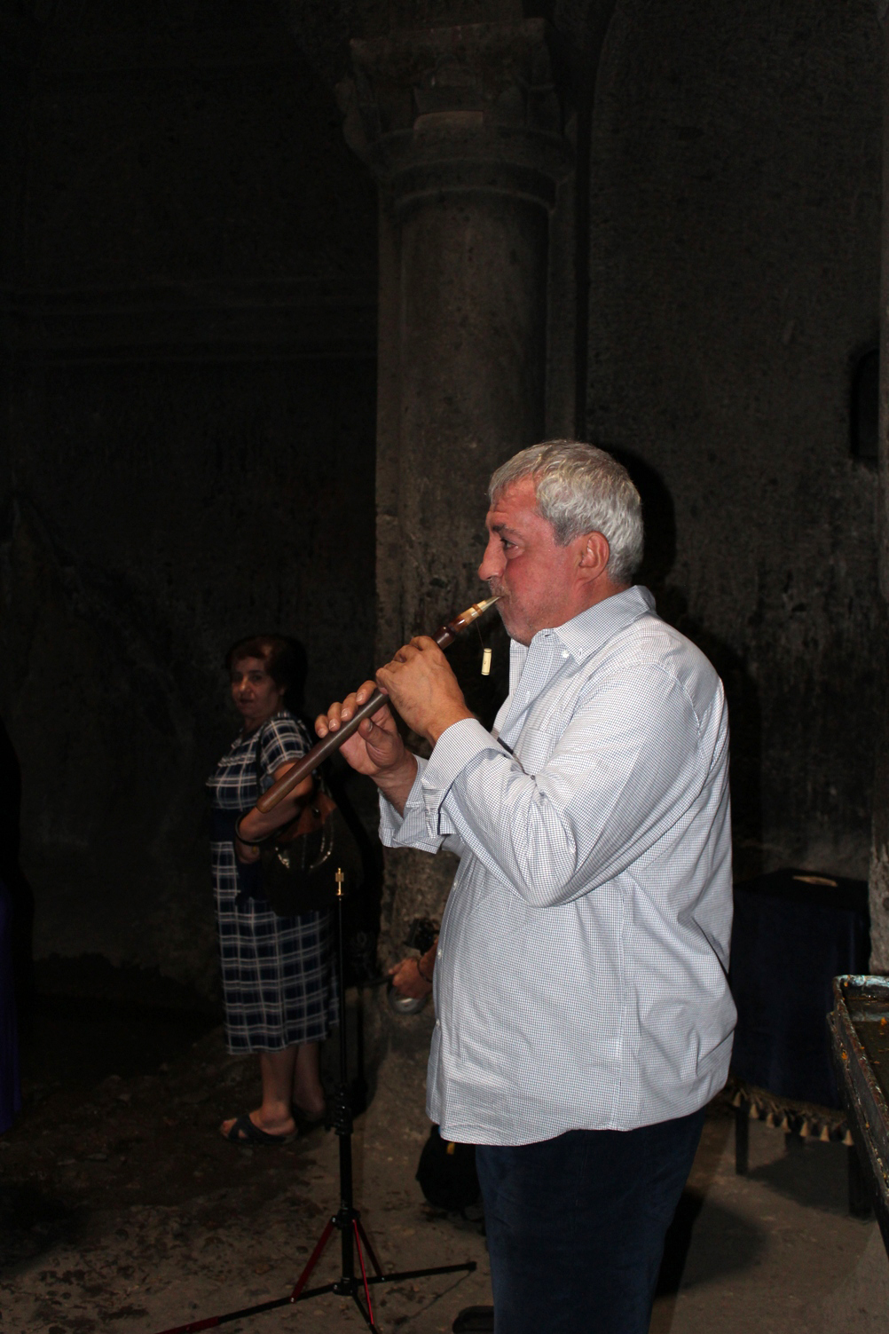 In the dimly li9t chamber a carved cross. | A minute of bliss. Norik plays the duduk against the sound of babbling water inside the chamber...... |