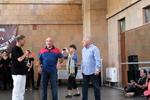 | We are now at the Armenian State Pedagogical University where tour facilitator Stephan Gevorgan [right] introduces his brother Karen Gevorgyan [left], the Choreography Chair and President of National Dance Art Union. The Gevorgan's are a cultural family, particularly in dance, with even an academy of dance in California. | Students, who will be performing some dances for us. | The man at the left with video camera accompanied us throughout the tour, constantly recording videos. There are hours that will need to be edited, and whether we will ever see or obtain copies is moot. I took my own videos, including the dances here. [Personal DVD collection.] | The women dancers. Their dance style is fluid and soft with extended arm and hand gestures. Men's dances involve vigorous leg movements and stamping with little upper body action. |