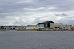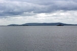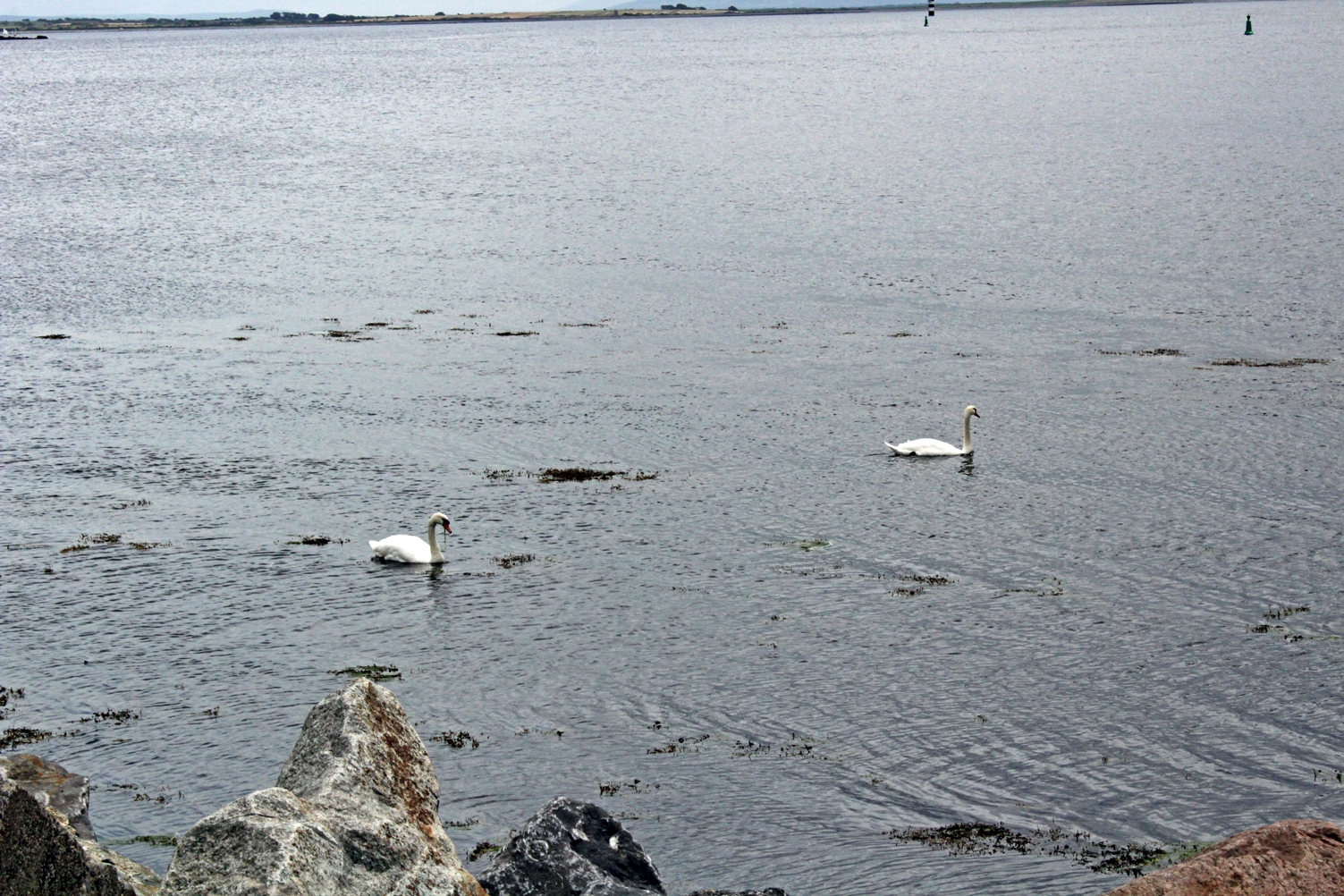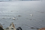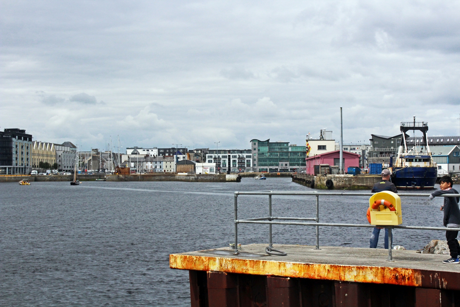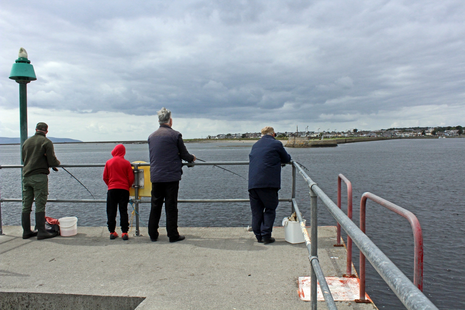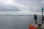 | Heading along the harbor and waterfront. | Looking back toward the city and at the left the exit of River Corrib. | At the mouth of the harbor some fisherfolk. | Another man fishing, looking out at the bay and the distant shore of County Clare. |