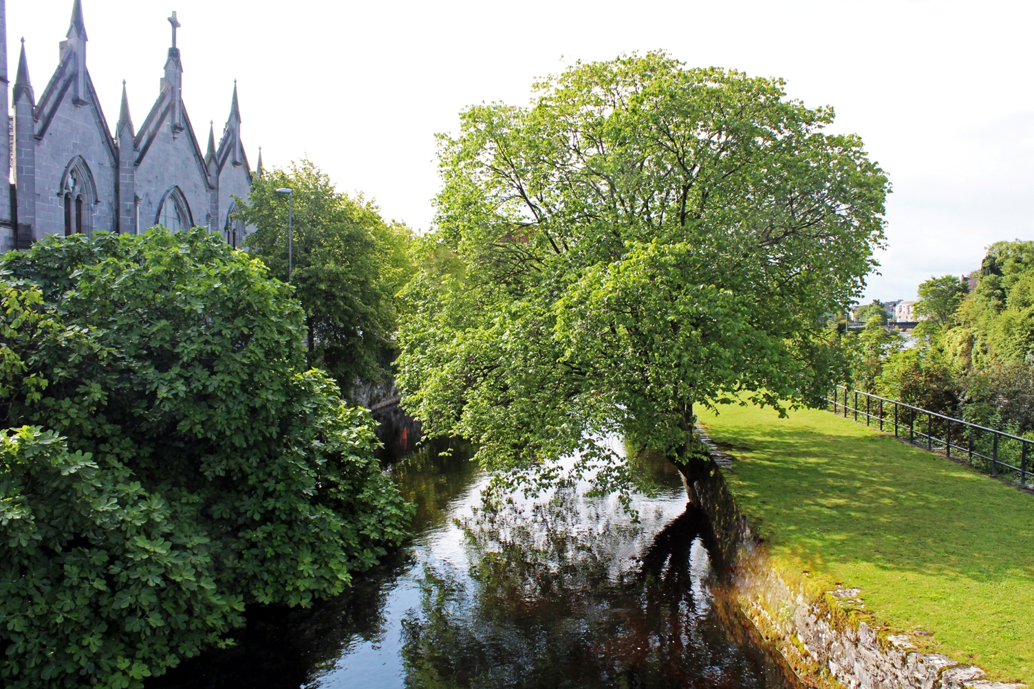 Heading north along the river, is this pleasant spot. | Galway Cathedral is across the bridge on Nuns Island. | A close-up view. | River Corrub. | Returning, I look into this alley. |