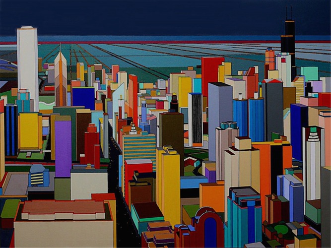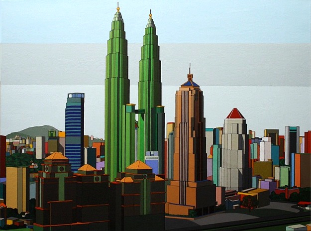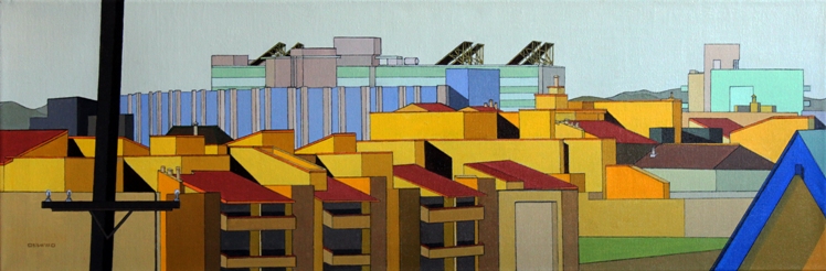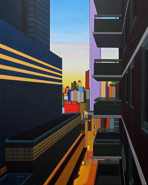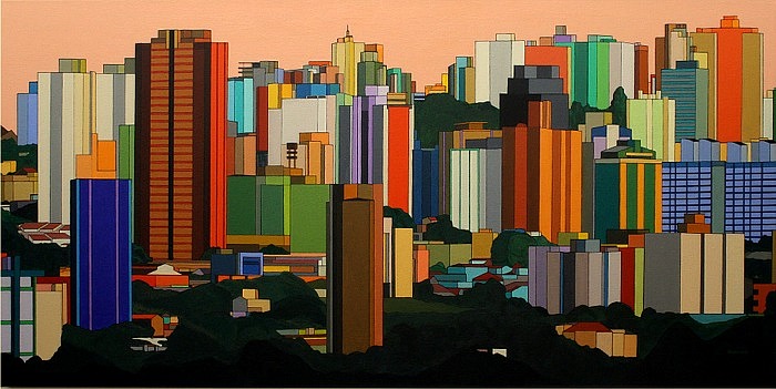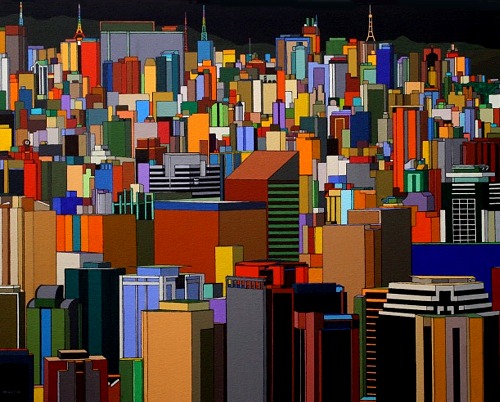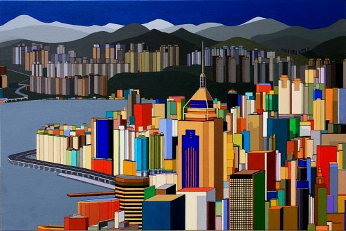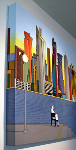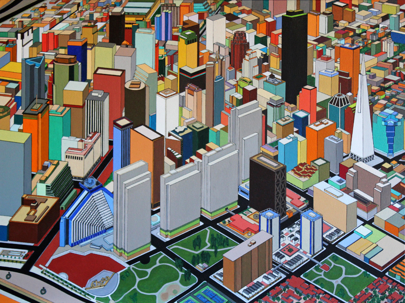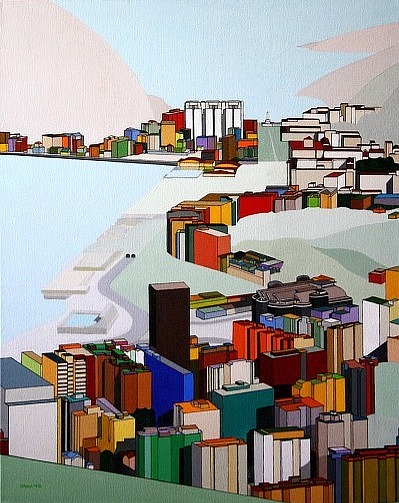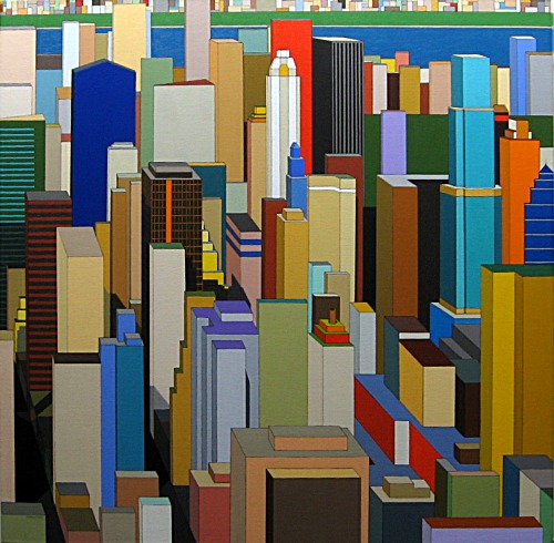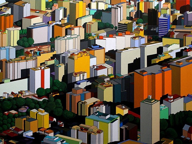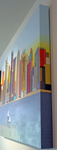 These images are part of an ongoing series begun in autumn 2008, This page is of mature, recent paintings since 2009 that look at cities from a distance and as an alternate reality.