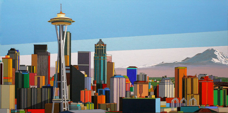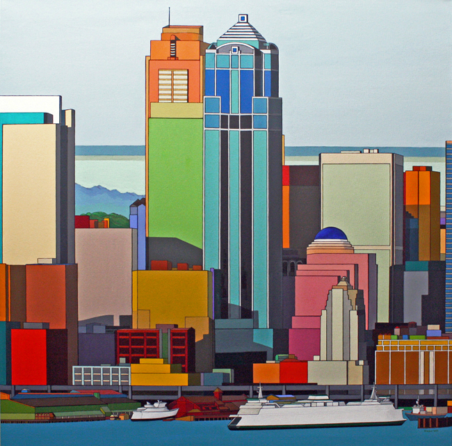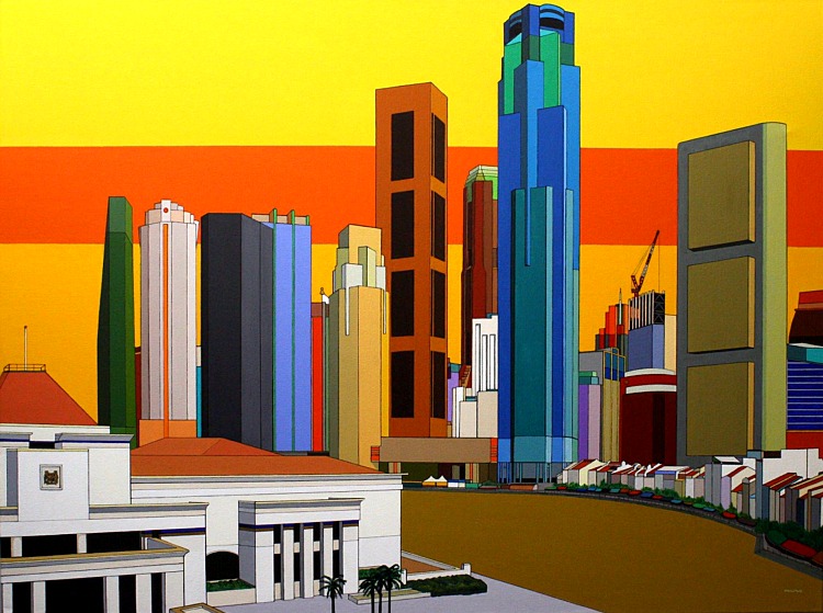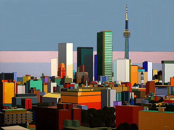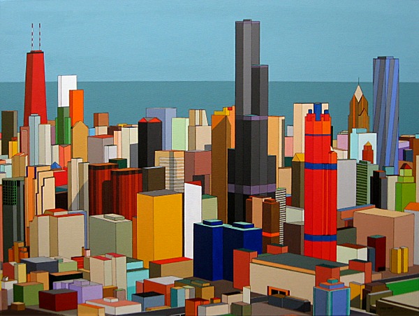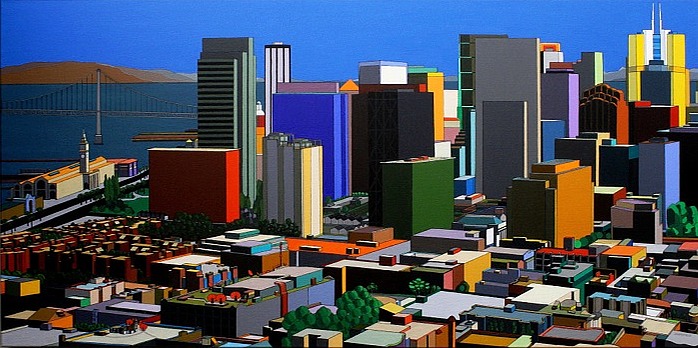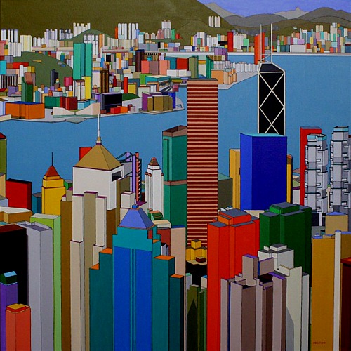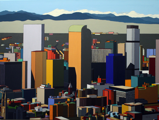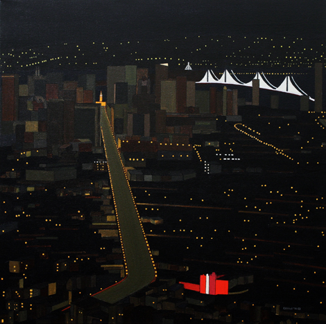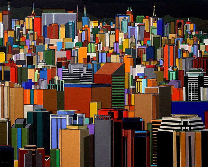 These images are part of an ongoing series begun in autumn 2008, This page is of mature, recent paintings since 2009 that look at cities from a distance and as an alternate reality.