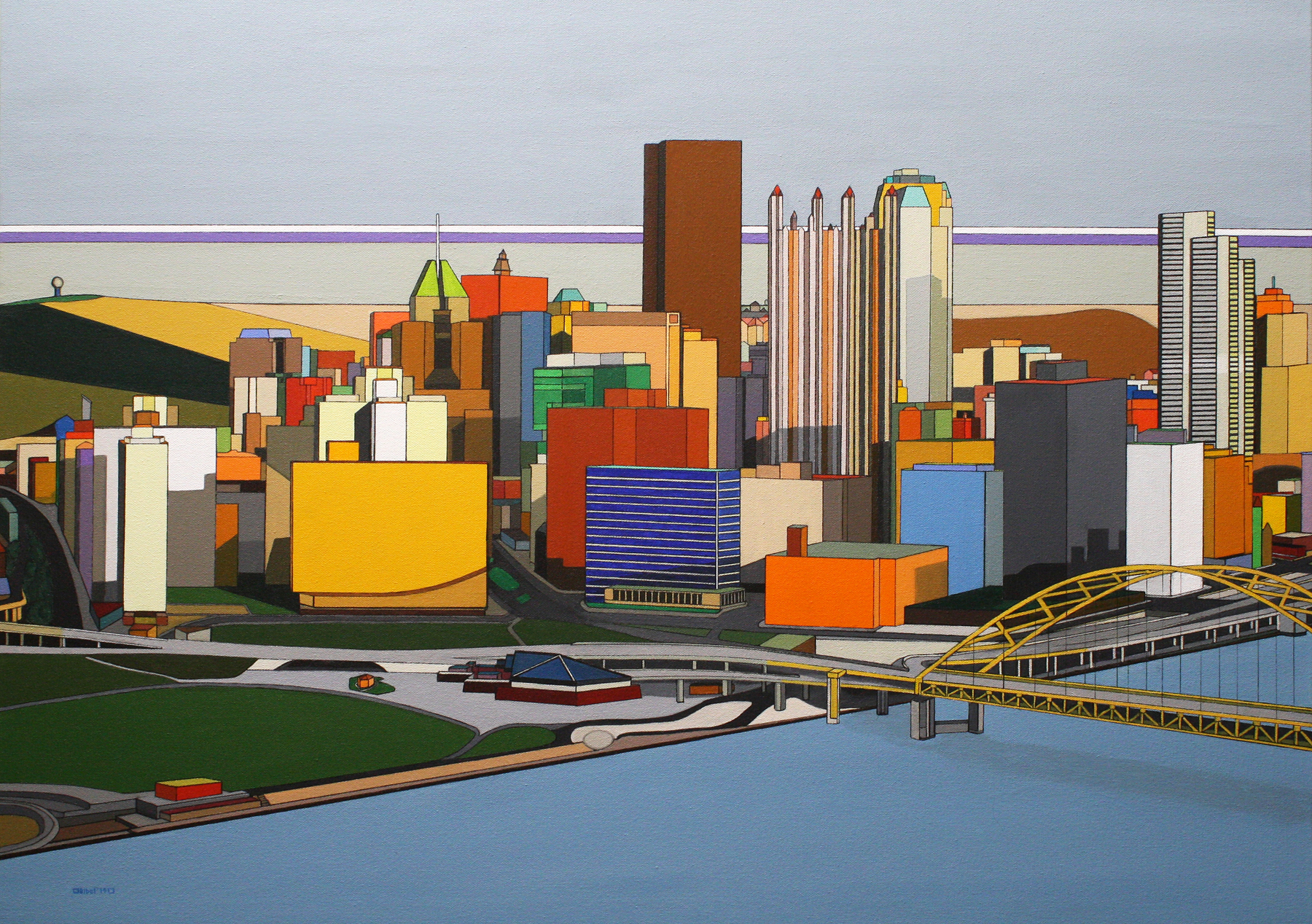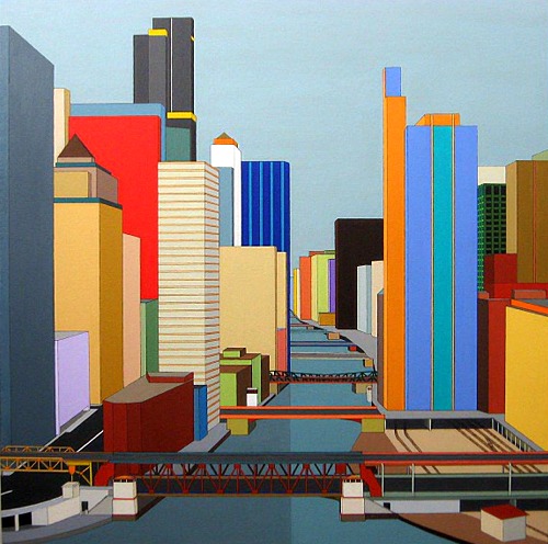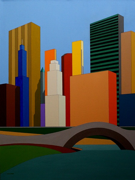 After an exploration of geometric morphological forms—the square, the rectangle, the circle, arrays of stripes, lines, and dots—time comes to bring the elements together. Abstract forms and representations of the Circle & Line series have led to easily recognizable landscapes. Thus, the artist returns to the structural forms of her youth but with the eyes and techniques of maturity. Solids, intense colors, and geometry, the Bibel hallmark, persists. This page is the result of several works of early development and exploration of entirely imaginary structures. The source cities are recognizable but the paintings do not depict them as they are. Architecture is reduced to core lines and buildings are seen mystically, the intensity and contrast of hues akin to that perceived with prolonged meditation and other means of altered consciousness. Aside from this philosophical aspect, the art may be seen more fundamentally as orderly patterns of variously colored areas. Our consciousness and learning suggest familiar objects. Finally, this is in essence Fauvist architecture, with a touch of André Derain. Over time, the series has evolved from somewhat garish to more harmonious, mellow holistic hue combinations. Whether or not this morphological branch will extend into further evolved patterns or will become a truncated tributary remains to be seen, but the branching stream has become a river. |