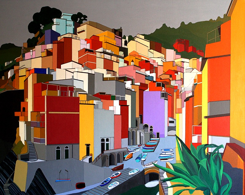 Italia (2014), 60 × 48 in.* The pattern of the multi-hued buildings may suggest my style, but I would have not chosen these colors and would have instead created a more harmonious, balanced array. No, this painting is based on reality, derived from photographs. The northwest Italian coastal town of Riomaggiore looks very much like this, though its colors are faded, eroded, and more mottled. |
