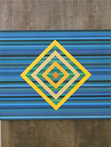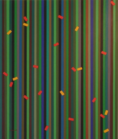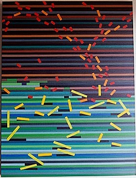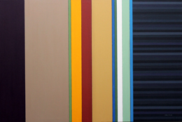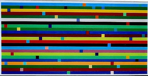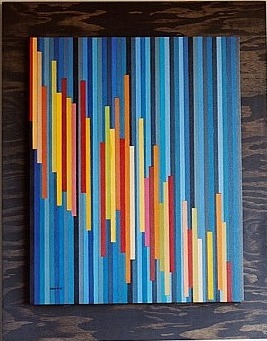 Stripes are powerful. There is implied movement, as a staircase or a flow of water. Stripes draw the eye upwards as in a forest, or deeper, as in corrugation, or peripherally, as in land and seascapes. Stripes of many colors are cheerful, but if restricted to black and white, they become sad, agitating, and imprisoning. Stripes, juxtaposed perpendicularly or out of phase, can create depth. Stripes are typically narrow but can be mixed in width to produced varied effects. Bibel explores stripes in the paintings here. |